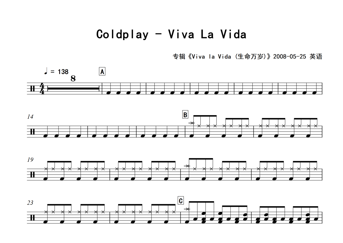 《Viva La Vida》是Coldplay演唱的一首歌曲,编配版,拍号为4/4拍,歌曲速度为每分钟138拍,这份架子鼓谱共有三张高清图谱,图谱由 @老虎不说谎 编配上传,图谱使用五线谱编配,使用这份Viva La Vida架子鼓谱,你将能够轻松地敲打出这首Coldplay的Viva La Vida,快来尝试吧。