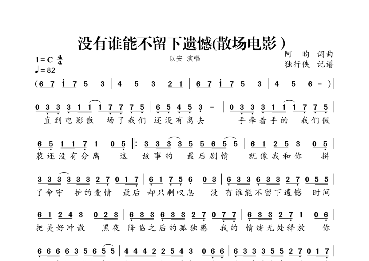 《没有谁能不留下遗憾(散场电影)》是以安演唱的一首歌曲,拍号为4/4拍,歌曲速度为每分钟82拍,这份简谱共有一张高清图谱,图谱由 @独行侠 编配上传。