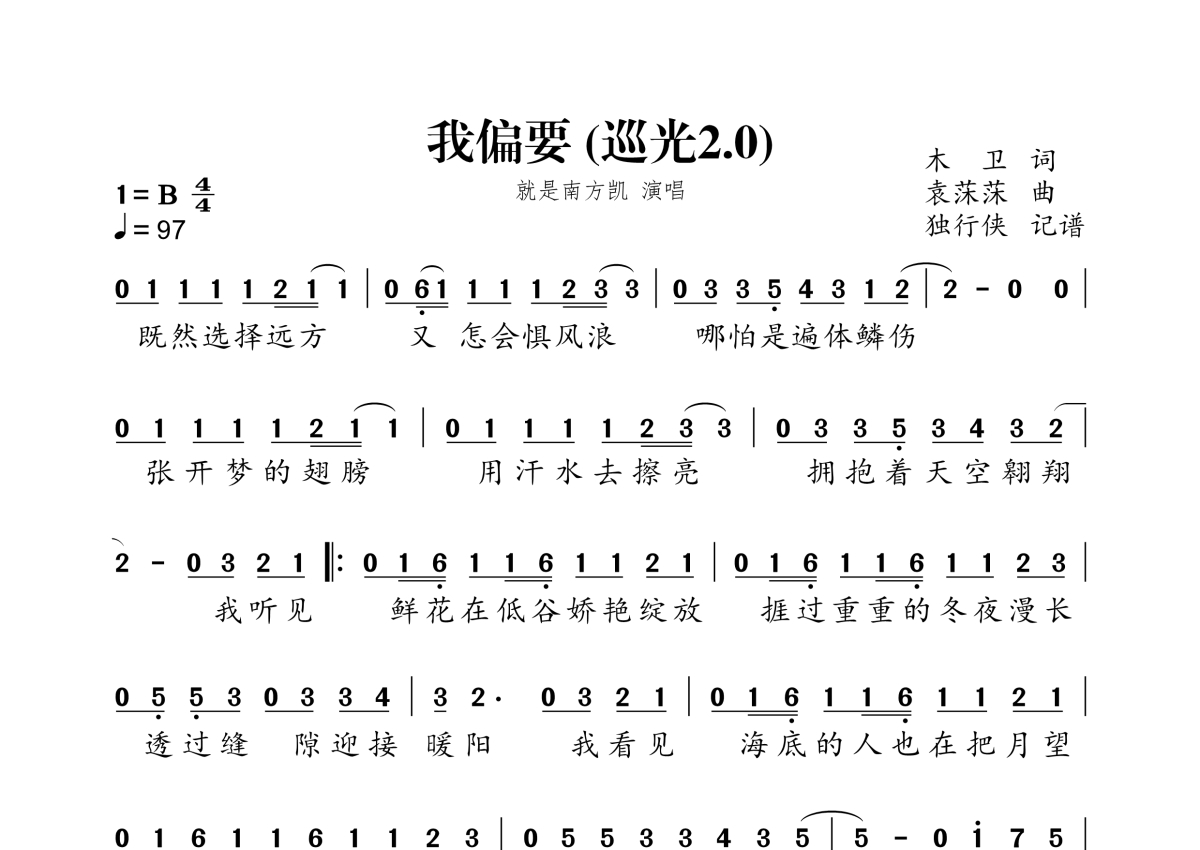 《我偏要 (巡光2.0)》是就是南方凯演唱的一首歌曲,拍号为4/4拍,歌曲速度为每分钟97拍,这份简谱共有一张高清图谱,图谱由 @独行侠 编配上传。