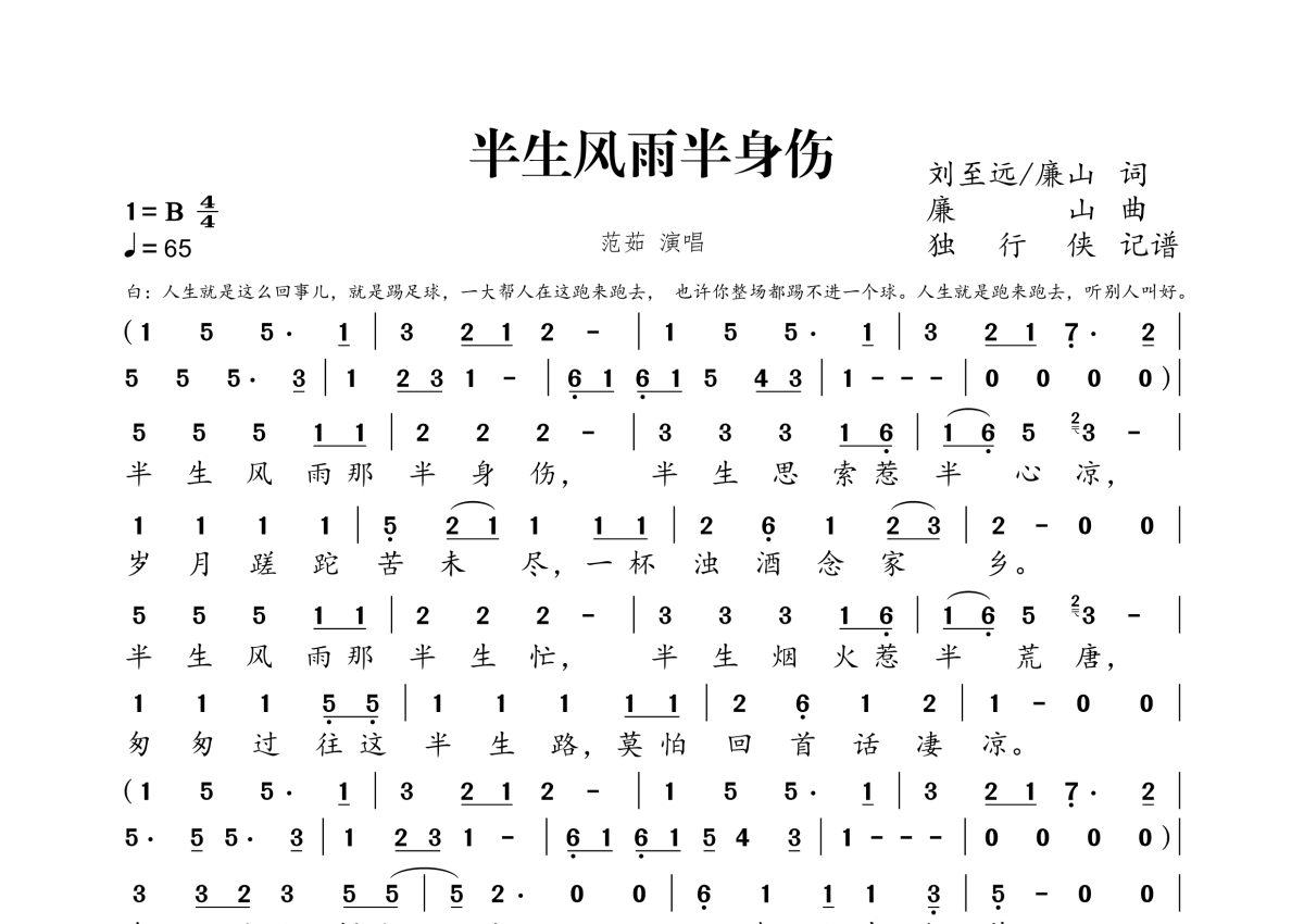 《半生风雨半身伤》是范茹演唱的一首歌曲,拍号为4/4拍,歌曲速度为每分钟63拍,这份简谱共有一张高清图谱,图谱由 @独行侠 编配上传。