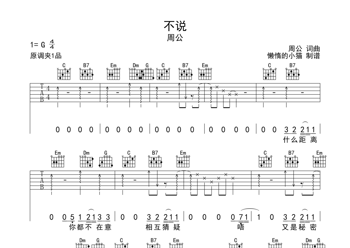 不说吉他谱 - 周公演唱 - G调弹唱六线谱