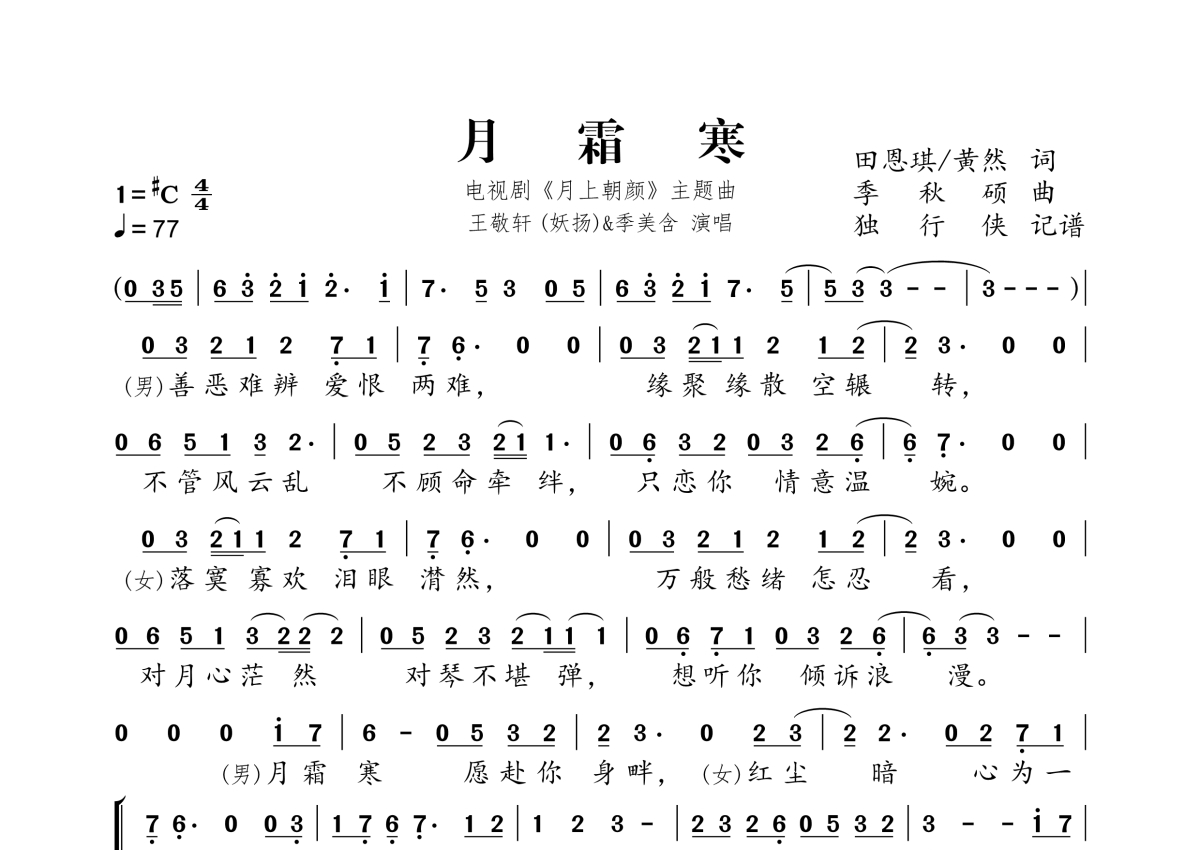 月霜寒简谱 - 王敬轩(妖扬)、季美含演唱