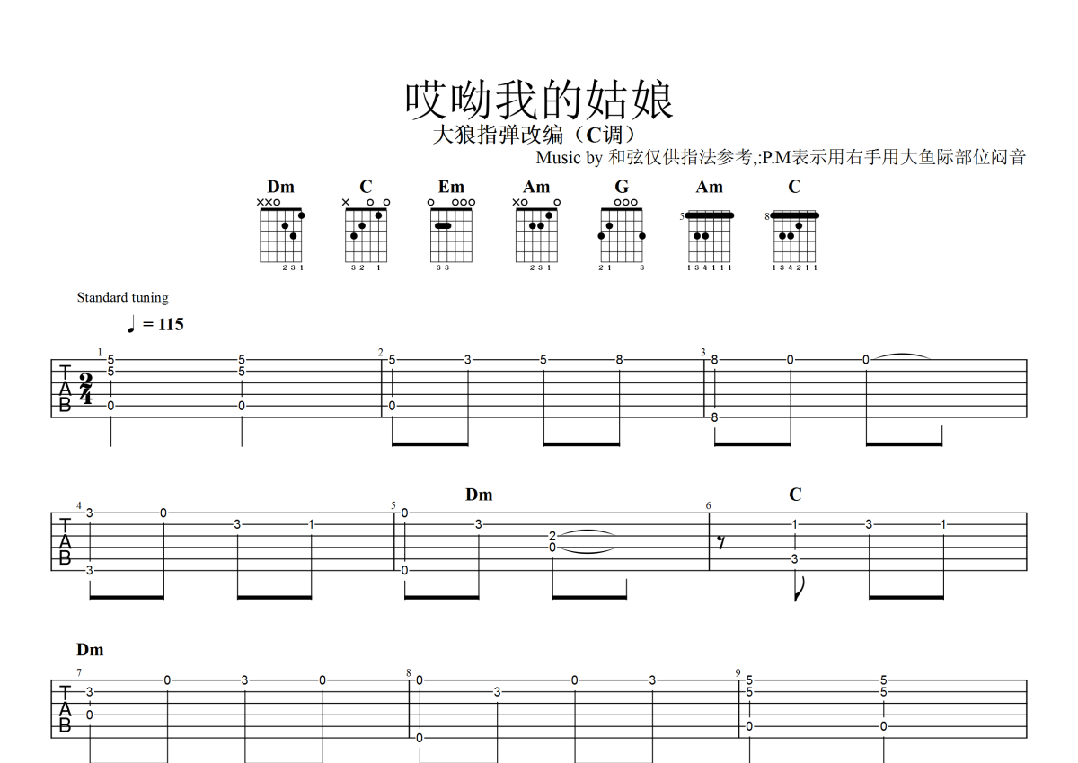 《哎哟我的姑娘》是抠抠演唱的一首歌曲,指弹独奏,本吉他谱采用的是C调指法编配,这份吉他谱共有四张高清图谱,图谱由 @大狼指弹 编配上传,图谱使用六线谱编配,曲谱配备了相关的音频提供试听,使用这份哎哟我的姑娘吉他谱,可以让你更加方便地掌握这首歌曲的演奏技巧,快来尝试吧。C 调指法通用且基础,前半部分简单易学,初学者能够快速入门,轻松掌握基本旋律,这降低了学习门槛。后半部分融入扫弦和闷音,丰富了演奏技巧。扫弦增添了节奏的活力与律动感,使乐曲情绪更饱满;闷音则制造出独特音效,增强层次感。这种前易后难的设计,既适合新手起步,又给有一定基础者提供挑战与提升空间,中等难度也激励学习者通过练习不断进步。