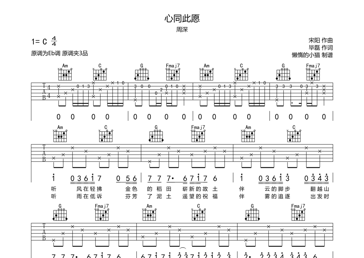 《心同此愿》是周深演唱的一首歌曲,拍号为4/4拍,歌曲速度为每分钟70拍,歌曲原调为Eb调,但由于原调指法比较难,为了方便弹奏,本吉他谱采用的是C调指法编配,变调夹3品弹奏即为原调,当然也可以根据自己的音域改变变调夹位置,或者通过改变和弦调性,以方便自己弹奏,这份吉他谱共有三张高清图谱,图谱由 @懒惰的小猫 编配上传,图谱使用六线谱编配,包含吉他和弦指法、简谱以及歌词部分,使用这份心同此愿吉他谱,可以让你更加方便地掌握这首歌曲的弹唱技巧,快来尝试吧。