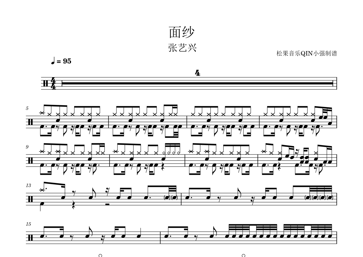 《面纱》是张艺兴演唱的一首歌曲,拍号为4/4拍,这份架子鼓谱共有两张高清图谱,图谱由 @松果音乐QIN小强 编配上传,图谱使用五线谱编配,使用这份面纱架子鼓谱,你将能够轻松地敲打出这首张艺兴的面纱,快来尝试吧。《面纱》是由张艺兴、樊帆作词,张艺兴、Mike Daley、Mitchell Owens等人作曲,张艺兴制作并演唱的歌曲,于2022年9月21日同该曲英文版《Veil》及MV共同发行,后收录于同月23日发行的概念专辑《西》中。