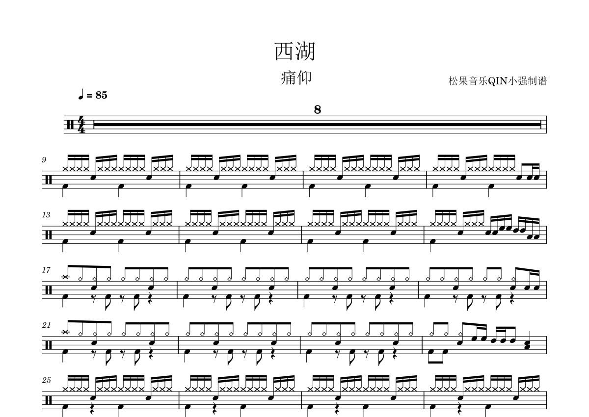 《西湖》是痛仰乐队演唱的一首歌曲,拍号为4/4拍,这份架子鼓谱共有两张高清图谱,图谱由 @松果音乐QIN小强 编配上传,图谱使用五线谱编配,使用这份西湖架子鼓谱,你将能够轻松地敲打出这首痛仰乐队的西湖,快来尝试吧。《西湖》是痛仰乐队演唱的一首歌曲。