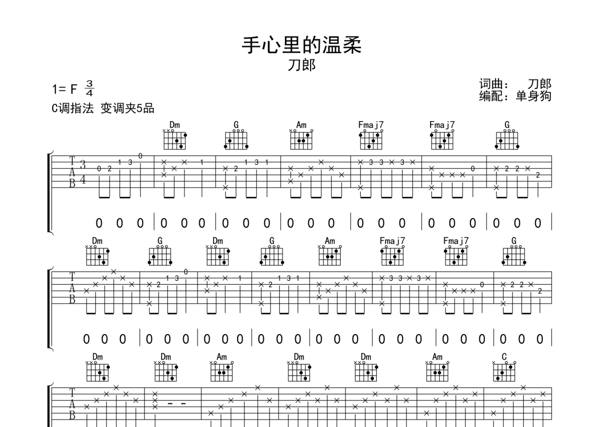《手心里的温柔》是刀郎演唱的一首歌曲,拍号为3/4拍,歌曲原调为F调,但由于原调指法比较难,为了方便弹奏,本吉他谱采用的是C调指法编配,变调夹5品弹奏即为原调,当然也可以根据自己的音域改变变调夹位置,或者通过改变和弦调性,以方便自己弹奏,这份吉他谱共有三张高清图谱,图谱由 @单身狗 编配上传,图谱使用六线谱编配,包含吉他和弦指法、简谱以及歌词部分,使用这份手心里的温柔吉他谱,可以让你更加方便地掌握这首歌曲的弹唱技巧,快来尝试吧。