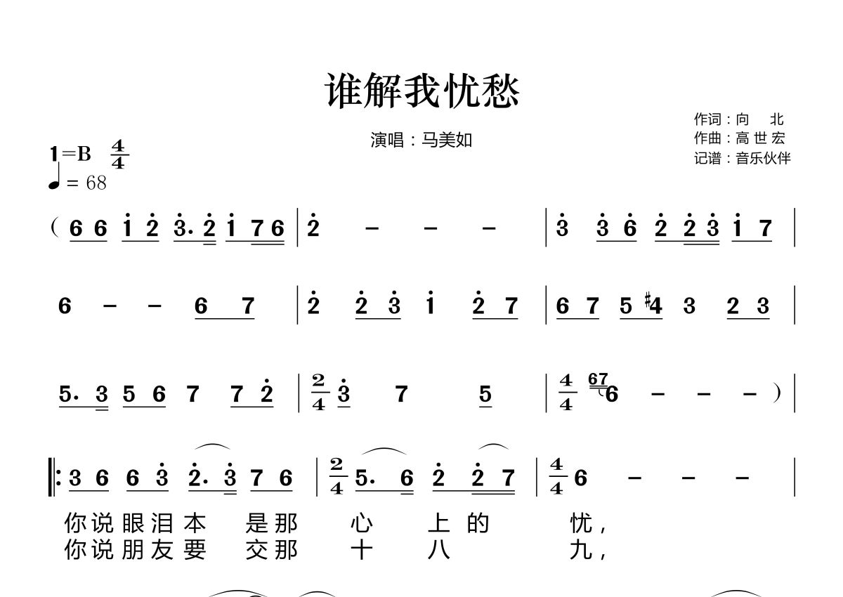 谁解我忧愁简谱 - 马美如演唱