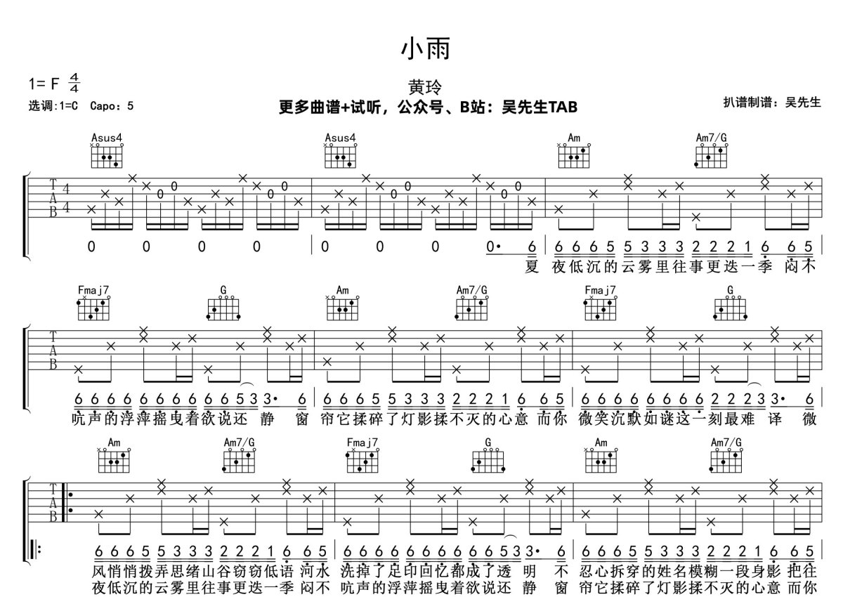 《小雨》是黄龄演唱的一首歌曲,本吉他谱采用的是C调指法编配,这份吉他谱共有两张高清图谱,图谱由 @吴先生TAB 编配上传,图谱使用六线谱编配,包含吉他和弦指法、简谱以及歌词部分,曲谱配备了相关的音频提供试听,使用这份小雨吉他谱,可以让你更加方便地掌握这首歌曲的弹唱技巧,快来尝试吧。黄龄《小雨》吉他弹唱谱,采用C调指法编配,吴先生TAB编配出品,共有2张高清图谱,免翻页排版设计。