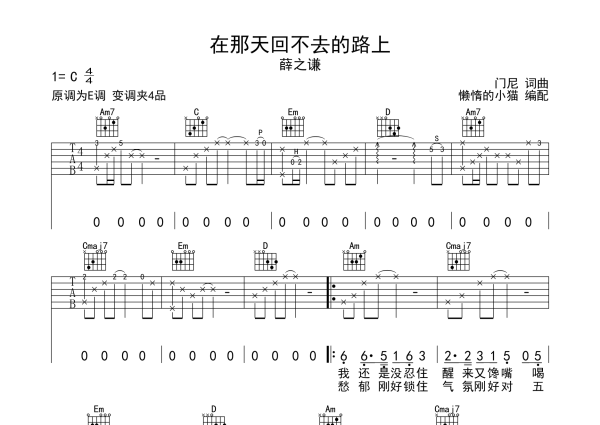 薛之谦《在那天回不去的路上》吉他谱 - C调弹唱六线谱
