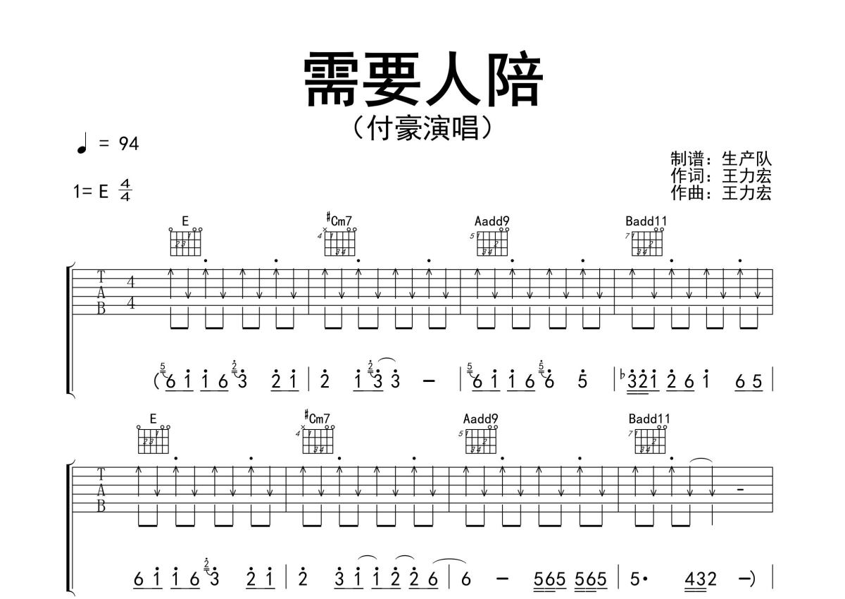《需要人陪》是付豪演唱的一首歌曲,精编扫弦版,拍号为4/4拍,歌曲速度为每分钟94拍,歌曲原调为E调,但由于原调指法比较难,为了方便弹奏,本吉他谱采用的是E调指法编配,演奏时不需要使用变调夹即为原调,这份吉他谱共有三张高清图谱,图谱由 @生产队 编配上传,图谱使用六线谱编配,包含吉他和弦指法、简谱以及歌词部分,使用这份需要人陪吉他谱,可以让你更加方便地掌握这首歌曲的弹唱技巧,快来尝试吧。付豪翻唱的经典歌曲《需要人陪》原版吉他谱,完整的前奏、间奏solo,原版扫弦切音节奏编配,致敬经典!。