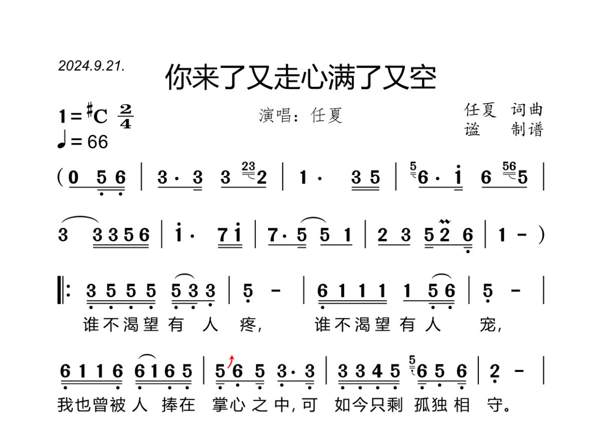 你来了又走心满了又空简谱 - 任夏演唱