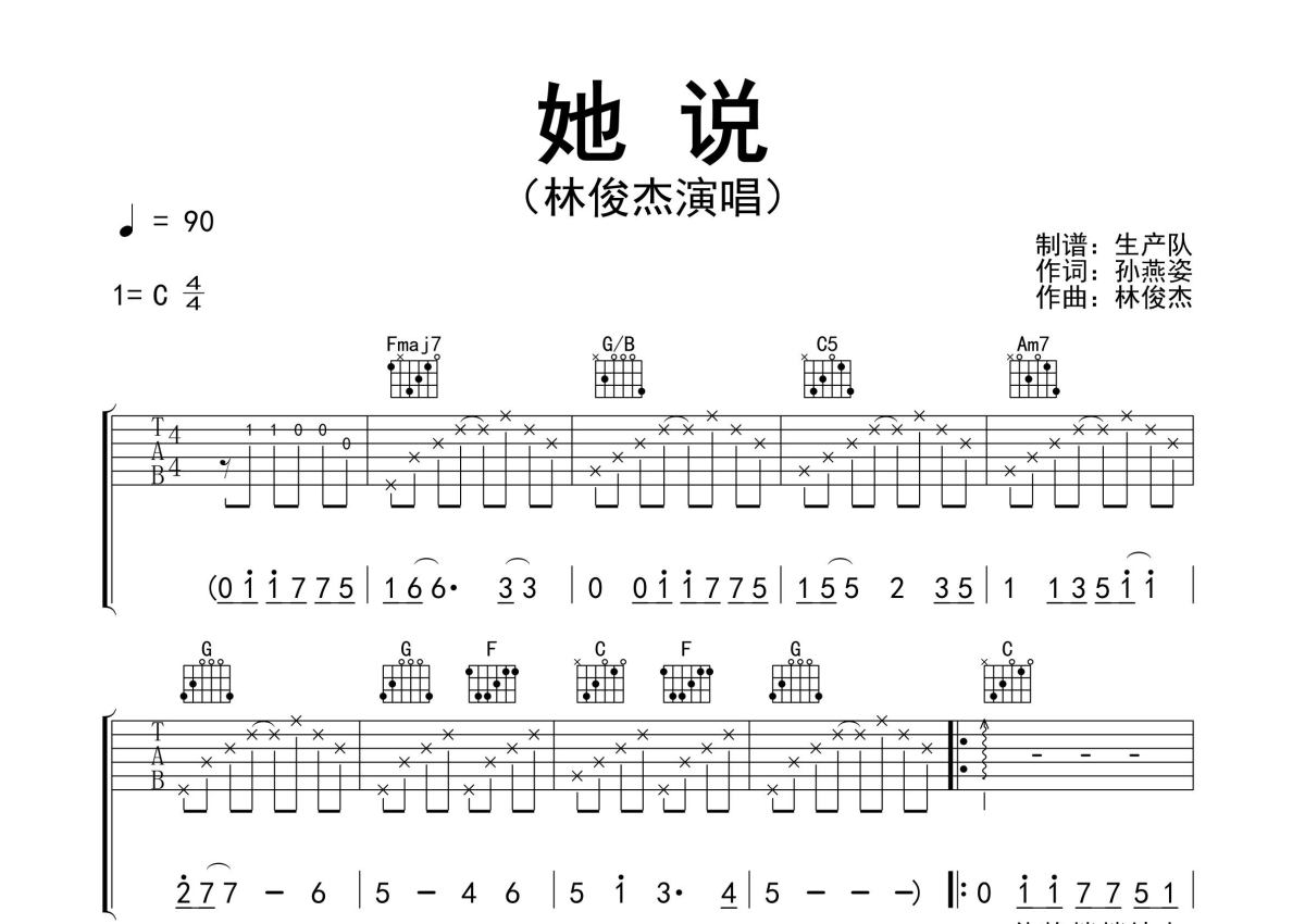 《她说》是林俊杰演唱的一首歌曲,精编民谣版,拍号为4/4拍,歌曲速度为每分钟90拍,歌曲原调为C调,本吉他谱采用的是C调指法编配,演奏时不需要使用变调夹即为原调,这份吉他谱共有三张高清图谱,图谱由 @生产队 编配上传,图谱使用六线谱编配,包含吉他和弦指法、简谱以及歌词部分,使用这份她说吉他谱,可以让你更加方便地掌握这首歌曲的弹唱技巧,快来尝试吧。林俊杰演唱的歌曲《她说》原版吉他谱,完整的前奏、间奏solo编配。