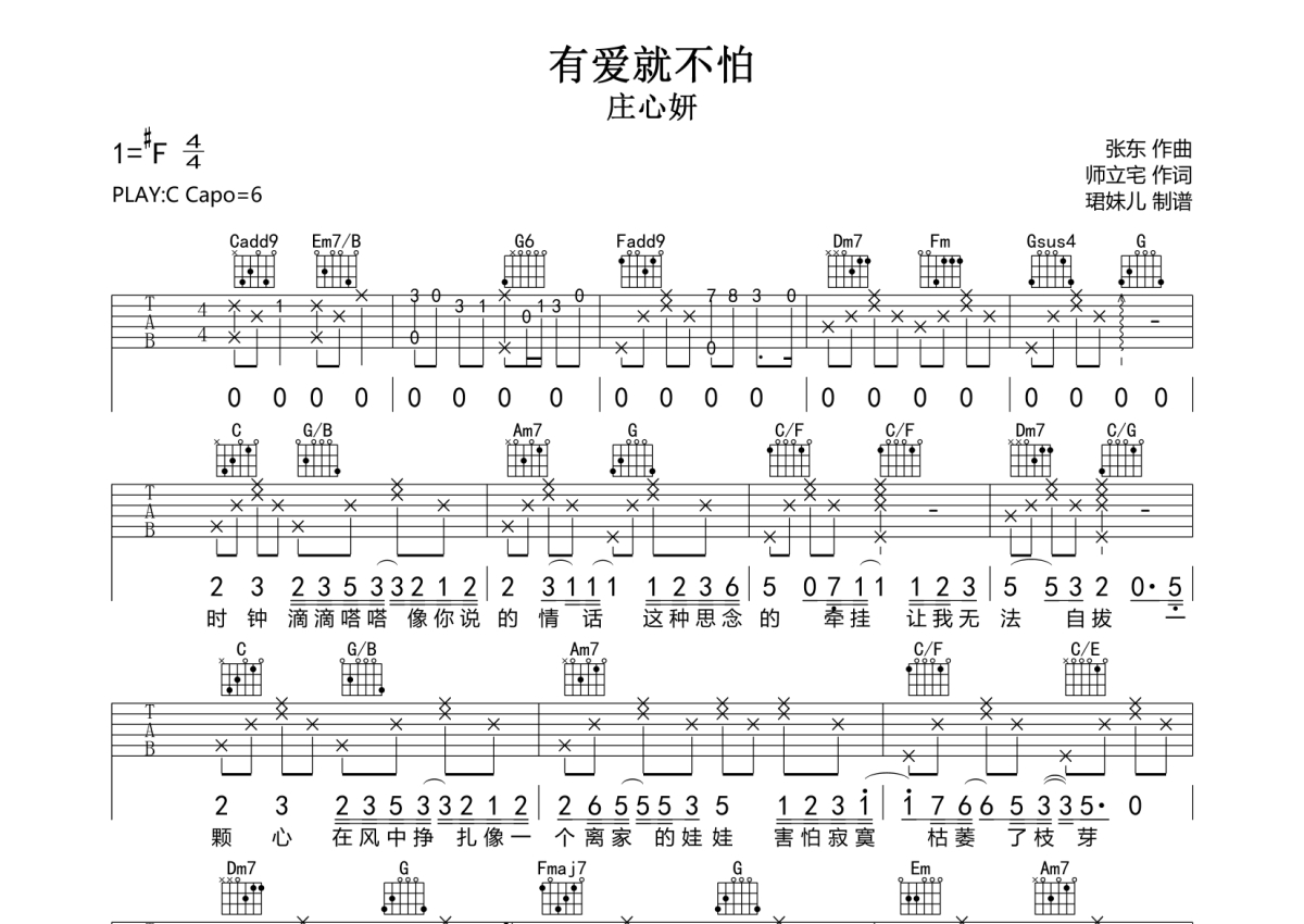 庄心妍《有爱就不怕》吉他谱 - C调弹唱六线谱