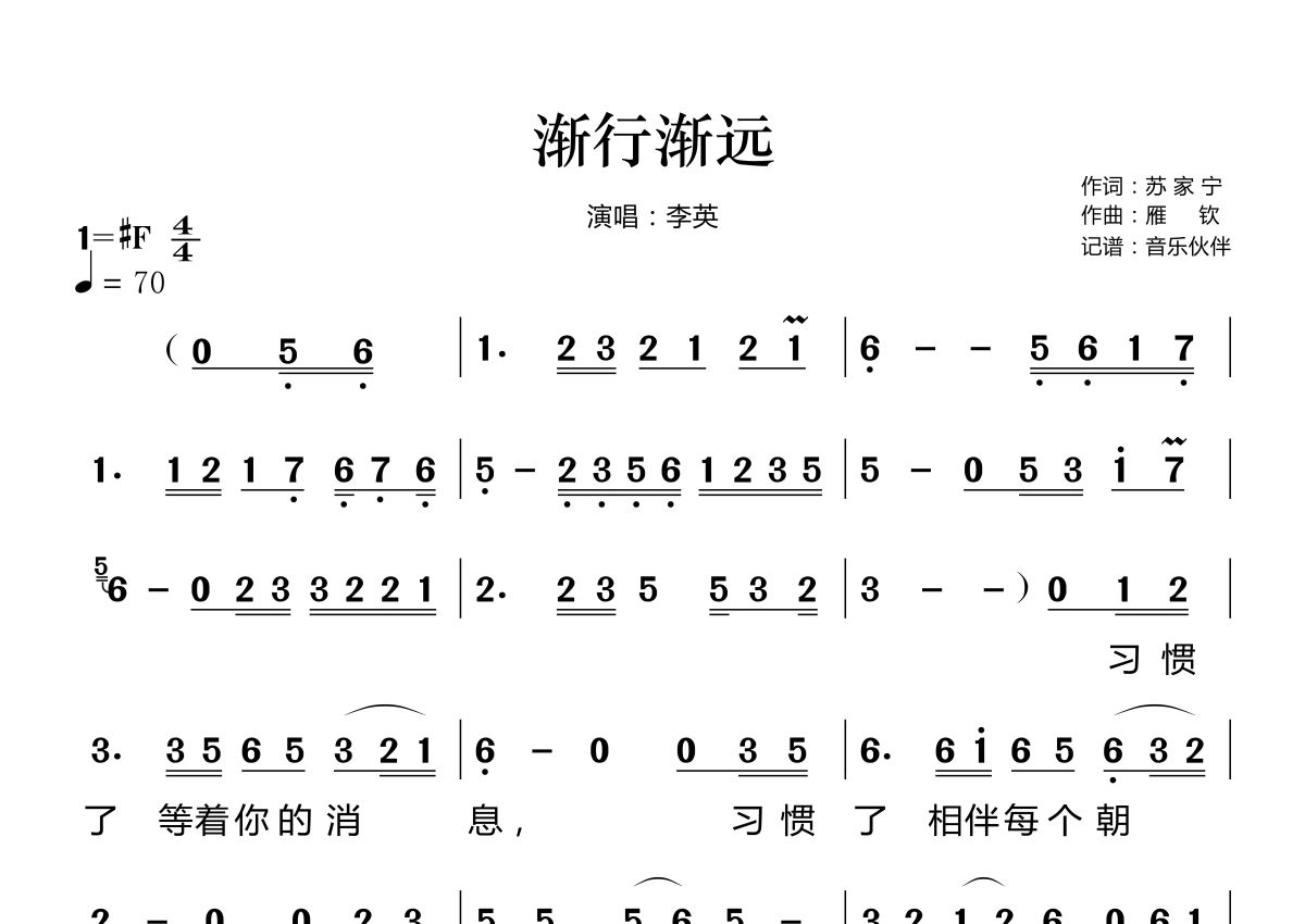 《渐行渐远》是李英演唱的一首歌曲,拍号为4/4拍,歌曲速度为每分钟70拍,这份简谱共有两张高清图谱,图谱由 @音乐伙伴 编配上传。