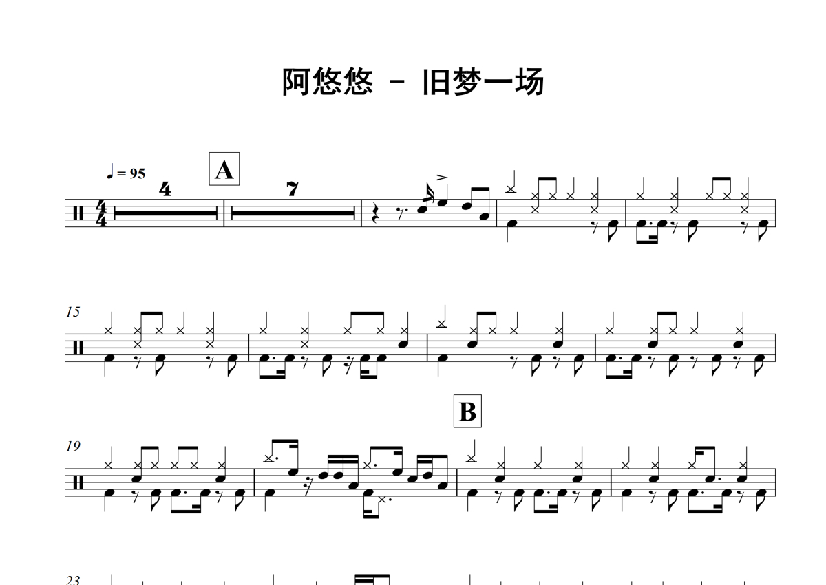《旧梦一场》是阿悠悠演唱的一首歌曲,这份架子鼓谱共有两张高清图谱,图谱由 @积极处世 编配上传,图谱使用五线谱编配,使用这份旧梦一场架子鼓谱,你将能够轻松地敲打出这首阿悠悠的旧梦一场,快来尝试吧。