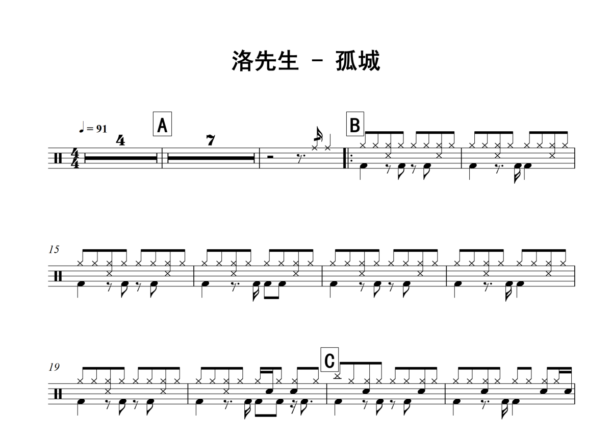 《孤城》是洛先生演唱的一首歌曲,这份架子鼓谱共有两张高清图谱,图谱由 @举个例子 编配上传,图谱使用五线谱编配,使用这份孤城架子鼓谱,你将能够轻松地敲打出这首洛先生的孤城,快来尝试吧。