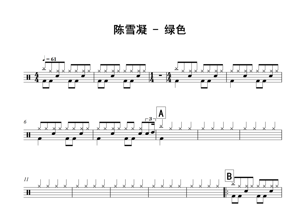 《绿色》是陈雪凝演唱的一首歌曲,这份架子鼓谱共有两张高清图谱,图谱由 @举个例子 编配上传,图谱使用五线谱编配,使用这份绿色架子鼓谱,你将能够轻松地敲打出这首陈雪凝的绿色,快来尝试吧。