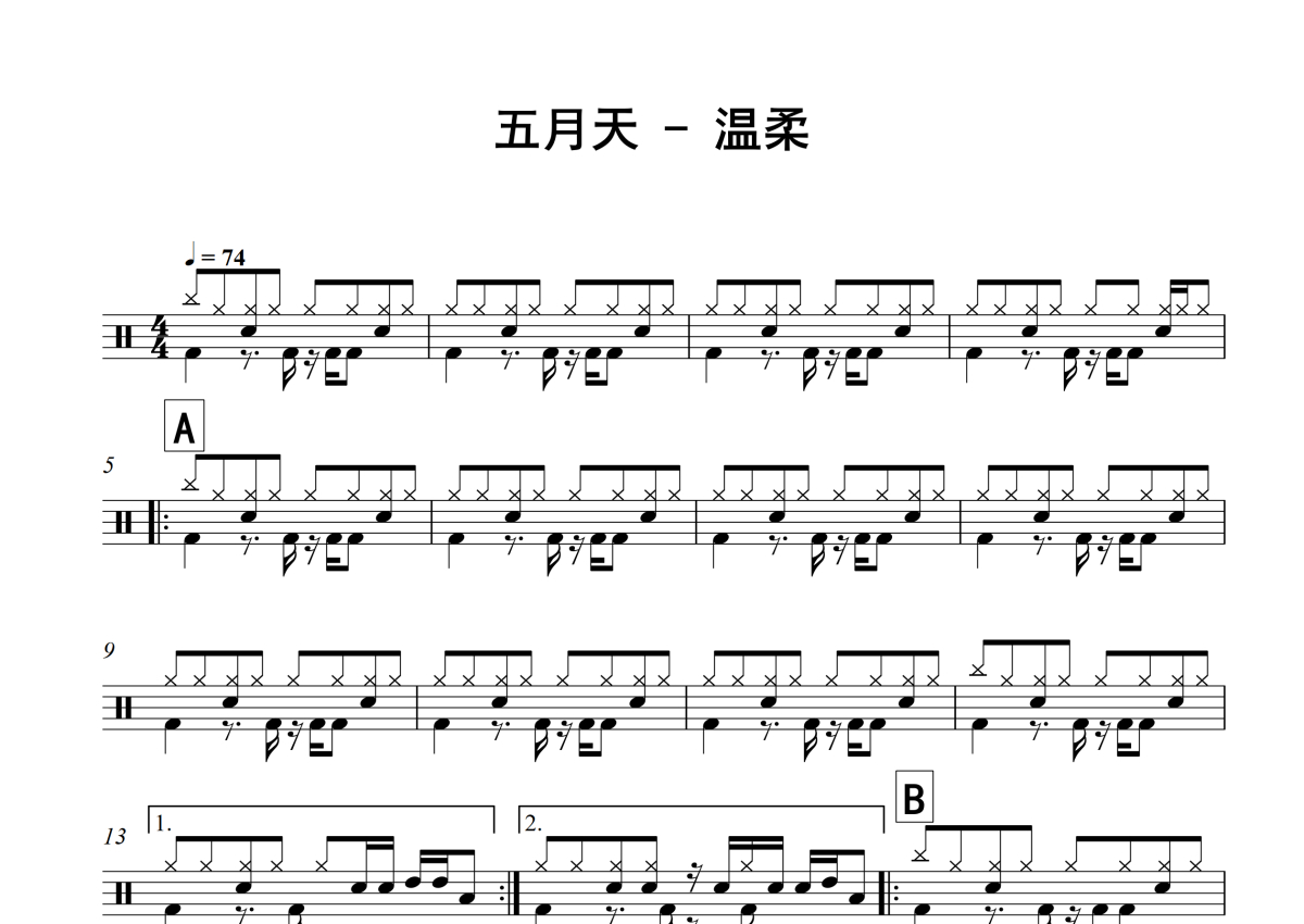 《温柔》是五月天演唱的一首歌曲,这份架子鼓谱共有两张高清图谱,图谱由 @举个例子 编配上传,图谱使用五线谱编配,使用这份温柔架子鼓谱,你将能够轻松地敲打出这首五月天的温柔,快来尝试吧。