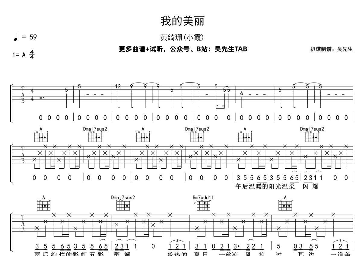 《我的美丽》是黄绮珊(小霞)演唱的一首歌曲,本吉他谱采用的是A调指法编配,这份吉他谱共有两张高清图谱,图谱由 @吴先生TAB 编配上传,图谱使用六线谱编配,包含吉他和弦指法、简谱以及歌词部分,曲谱配备了相关的音频提供试听,使用这份我的美丽吉他谱,可以让你更加方便地掌握这首歌曲的弹唱技巧,快来尝试吧。黄绮珊(小霞)《我的美丽》吉他弹唱谱,采用A调指法编配,吴先生TAB编配出品,共有2张高清图谱,免翻页排版设计。