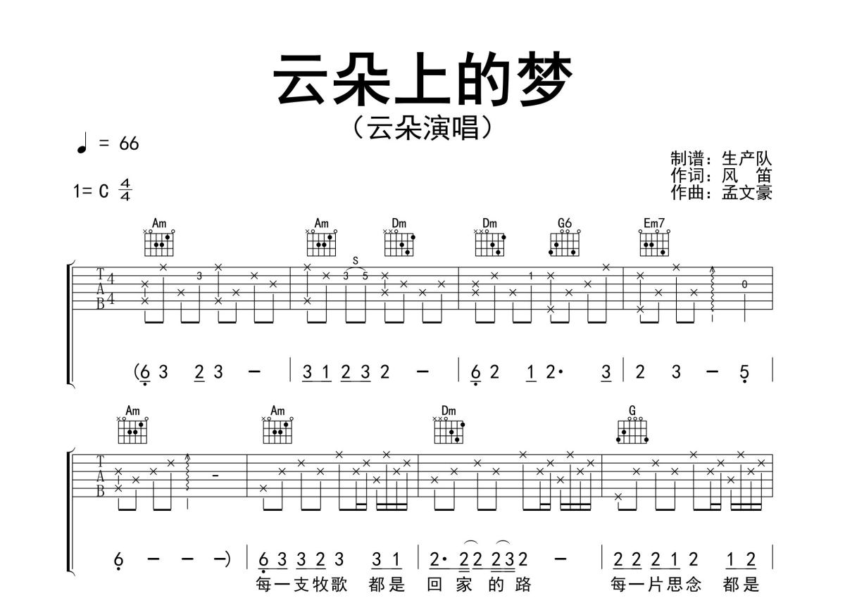 《云朵上的梦》是云朵演唱的一首歌曲,精编完美版,拍号为4/4拍,歌曲速度为每分钟66拍,歌曲原调为C调,本吉他谱采用的是C调指法编配,演奏时不需要使用变调夹即为原调,这份吉他谱共有三张高清图谱,图谱由 @生产队 编配上传,图谱使用六线谱编配,包含吉他和弦指法、简谱以及歌词部分,使用这份云朵上的梦吉他谱,可以让你更加方便地掌握这首歌曲的弹唱技巧,快来尝试吧。云朵演唱的歌曲《云朵上的梦》原版吉他谱,完整的前奏、间奏solo编配,值得推荐的一首优秀作品。