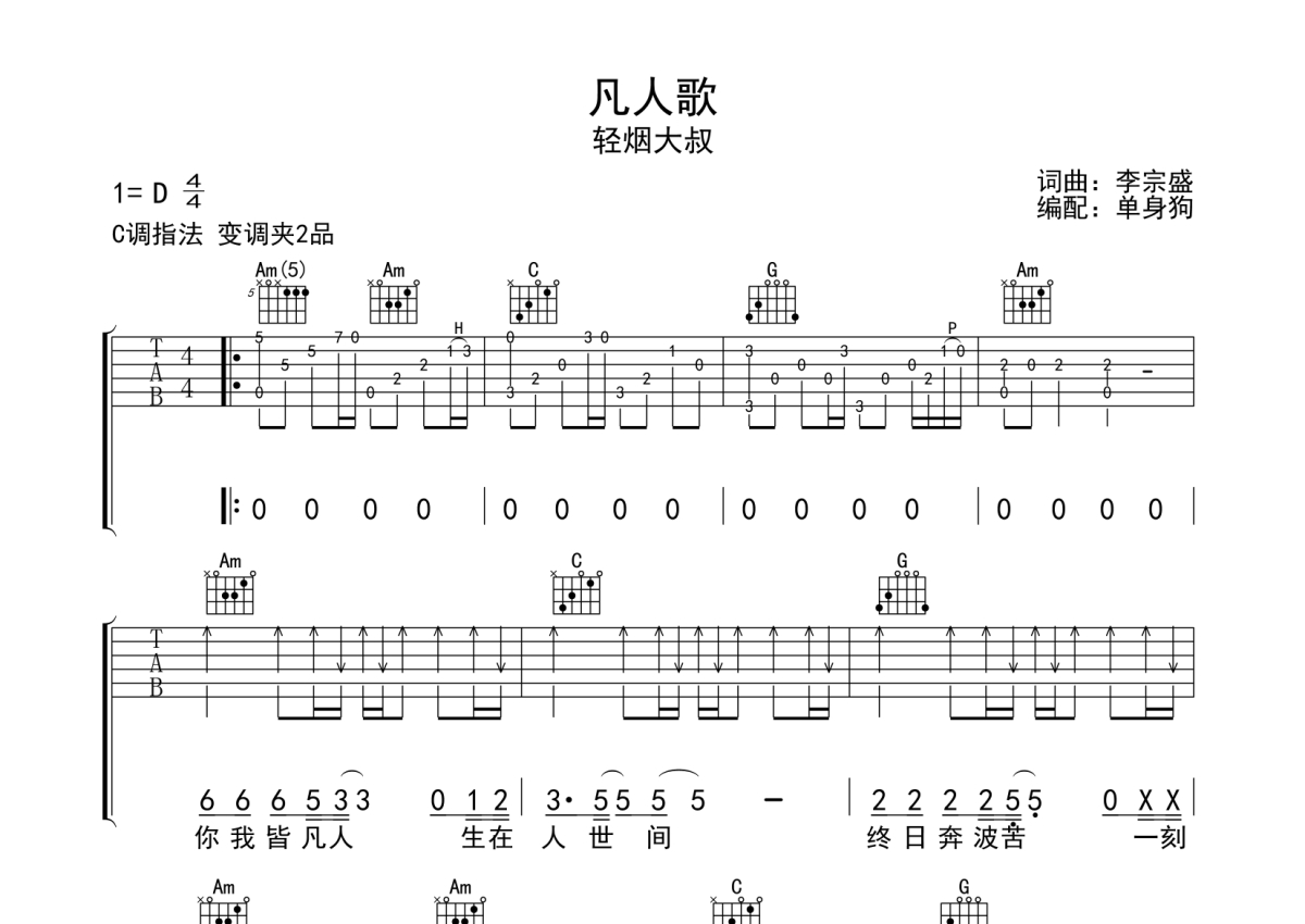 轻烟大叔《凡人歌》吉他谱 - C调弹唱六线谱