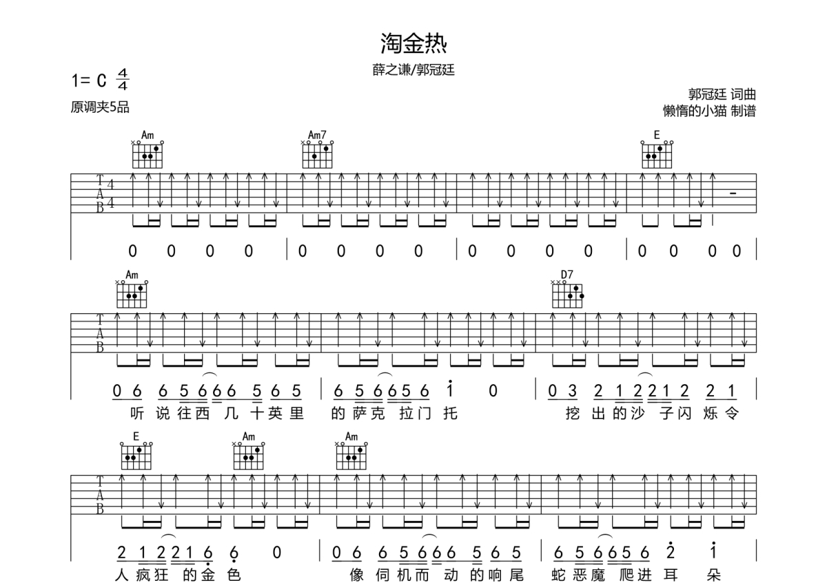 薛之谦/郭冠廷《淘金热》吉他谱 - C调弹唱六线谱