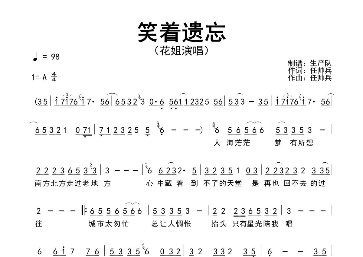 《笑着遗忘》是花姐演唱的一首歌曲,原版简谱,拍号为4/4拍,歌曲速度为每分钟98拍,这份简谱共有一张高清图谱,图谱由 @生产队 编配上传花姐演唱的歌曲《笑着遗忘》原版简谱,精准的前奏、间奏、尾奏solo编配。