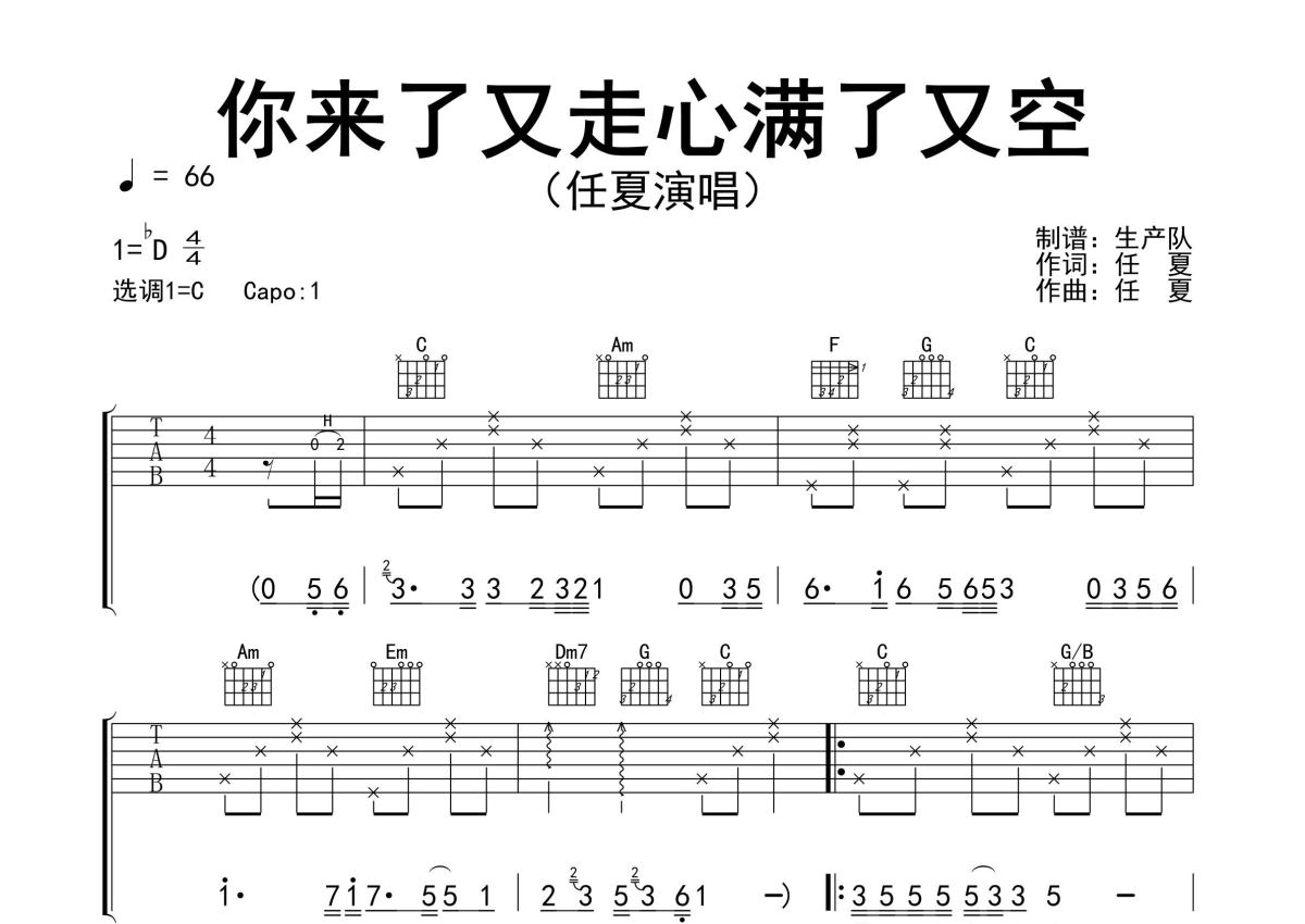 《你来了又走心满了又空》是任夏演唱的一首歌曲,精编完美版,拍号为4/4拍,歌曲速度为每分钟66拍,歌曲原调为Db调,但由于原调指法比较难,为了方便弹奏,本吉他谱采用的是C调指法编配,变调夹1品弹奏即为原调,当然也可以根据自己的音域改变变调夹位置,或者通过改变和弦调性,以方便自己弹奏,这份吉他谱共有三张高清图谱,图谱由 @生产队 编配上传,图谱使用六线谱编配,包含吉他和弦指法、简谱以及歌词部分,使用这份你来了又走心满了又空吉他谱,可以让你更加方便地掌握这首歌曲的弹唱技巧,快来尝试吧。任夏创作并演唱的歌曲《你来了又走心满了又空》原版吉他谱,精准的前奏、间奏、尾奏solo编配,一首动听值得推荐的民谣歌曲。