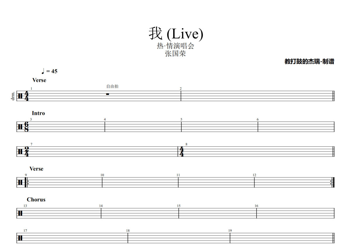 《我 (Live)》是张国荣演唱的一首歌曲,热·情演唱会,拍号为4/4拍,歌曲速度为每分钟45拍,这份架子鼓谱共有两张高清图谱,图谱由 @Jerry 编配上传,图谱使用五线谱编配,使用这份我 (Live)架子鼓谱,你将能够轻松地敲打出这首张国荣的我 (Live),快来尝试吧。