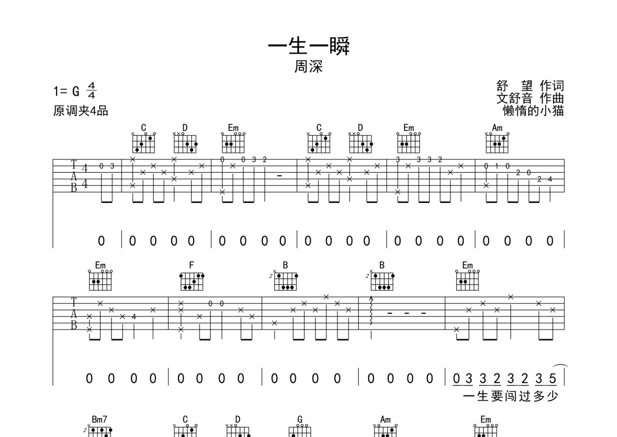 周深《一生一瞬》吉他谱 - G调弹唱六线谱