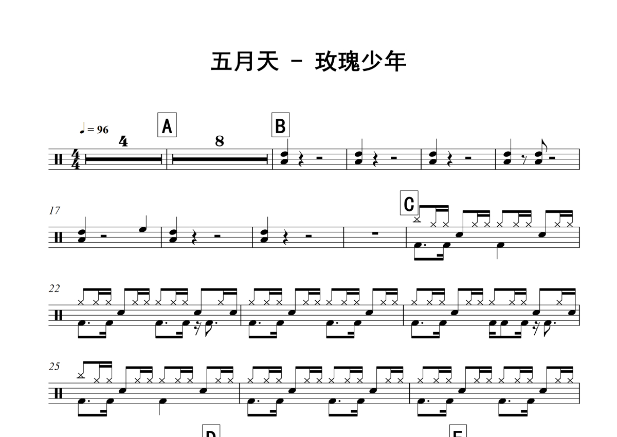 《玫瑰少年》是五月天演唱的一首歌曲,拍号为4/4拍,这份架子鼓谱共有两张高清图谱,图谱由 @积极处世 编配上传,图谱使用五线谱编配,使用这份玫瑰少年架子鼓谱,你将能够轻松地敲打出这首五月天的玫瑰少年,快来尝试吧。