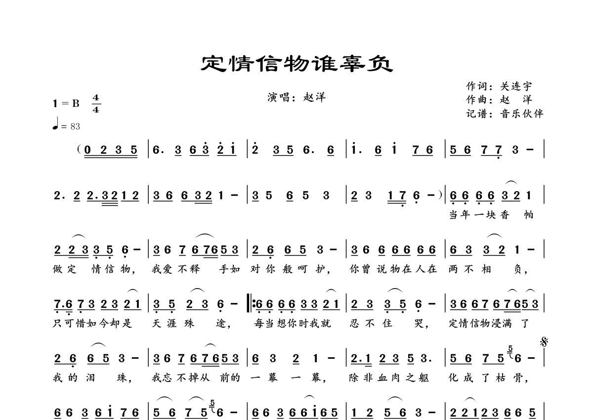 《定情信物谁辜负》是赵洋演唱的一首歌曲,拍号为4/4拍,歌曲速度为每分钟83拍,这份简谱共有一张高清图谱,图谱由 @音乐伙伴 编配上传。