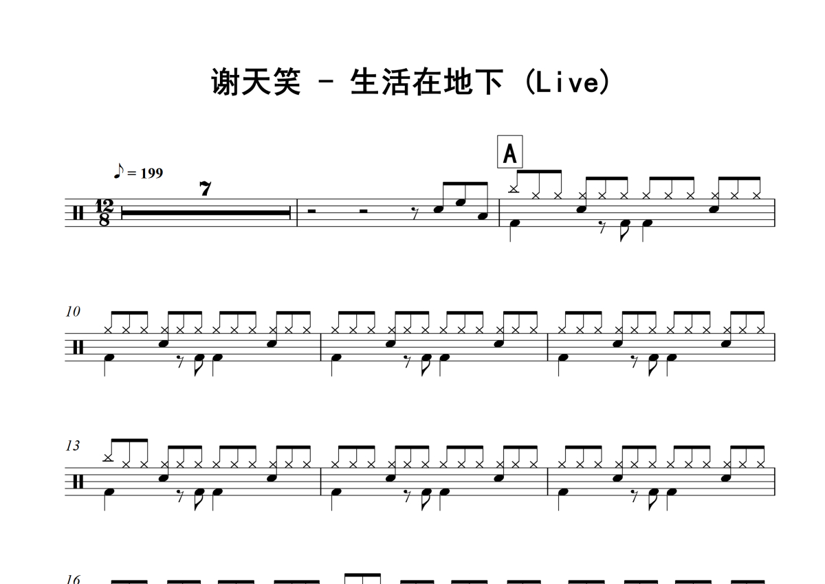 《生活在地下》是谢天笑演唱的一首歌曲,Live,歌曲速度为每分钟199拍,这份架子鼓谱共有三张高清图谱,图谱由 @积极处世 编配上传,图谱使用五线谱编配,使用这份生活在地下架子鼓谱,你将能够轻松地敲打出这首谢天笑的生活在地下,快来尝试吧。