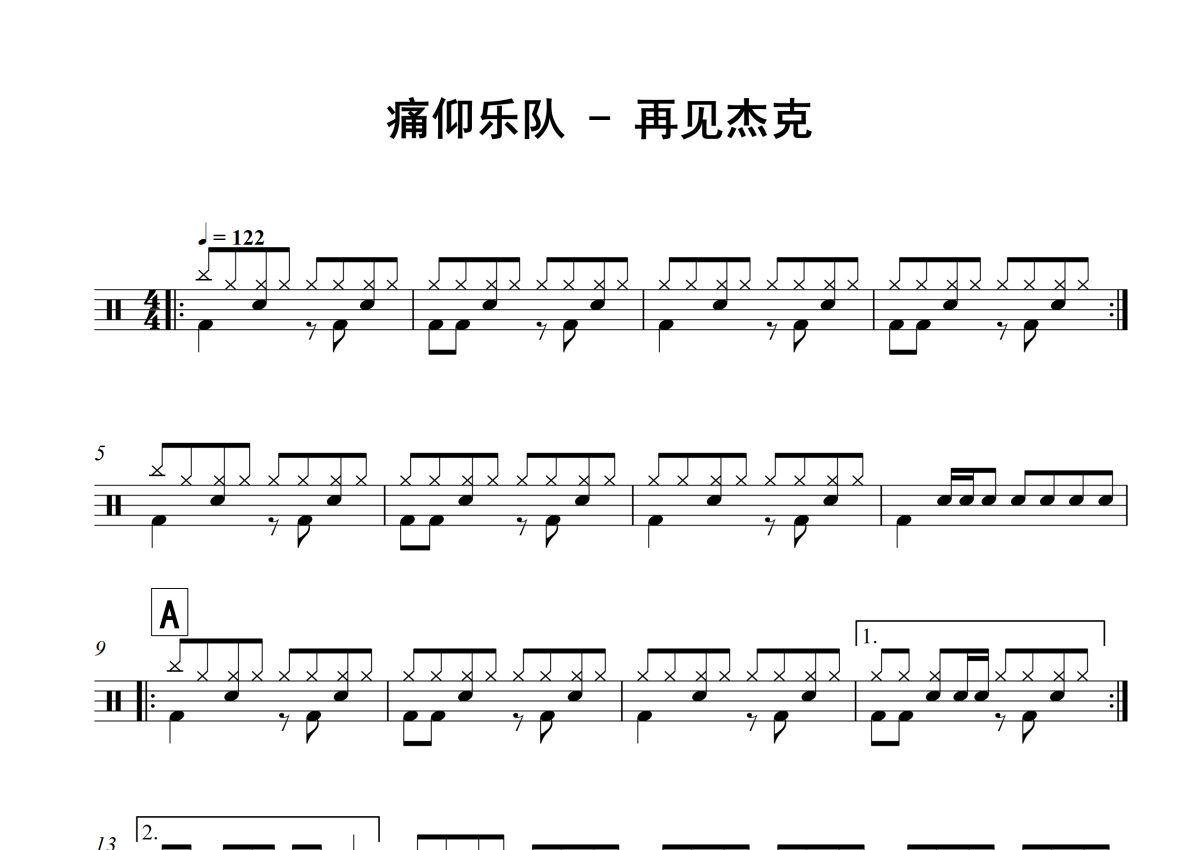 《再见杰克》是痛仰乐队演唱的一首歌曲,拍号为4/4拍,歌曲速度为每分钟122拍,这份架子鼓谱共有三张高清图谱,图谱由 @积极处世 编配上传,图谱使用五线谱编配,使用这份再见杰克架子鼓谱,你将能够轻松地敲打出这首痛仰乐队的再见杰克,快来尝试吧。