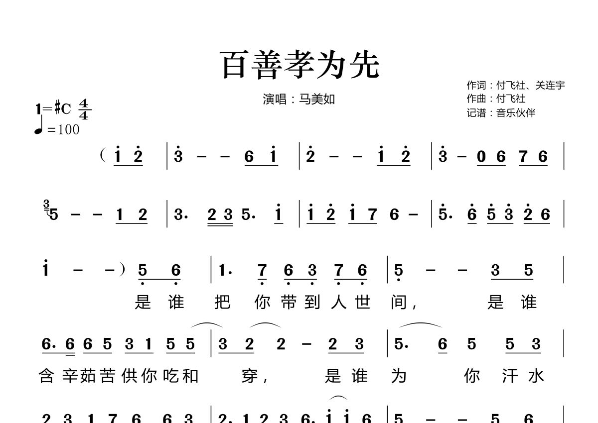 百善孝为先简谱 - 马美如演唱