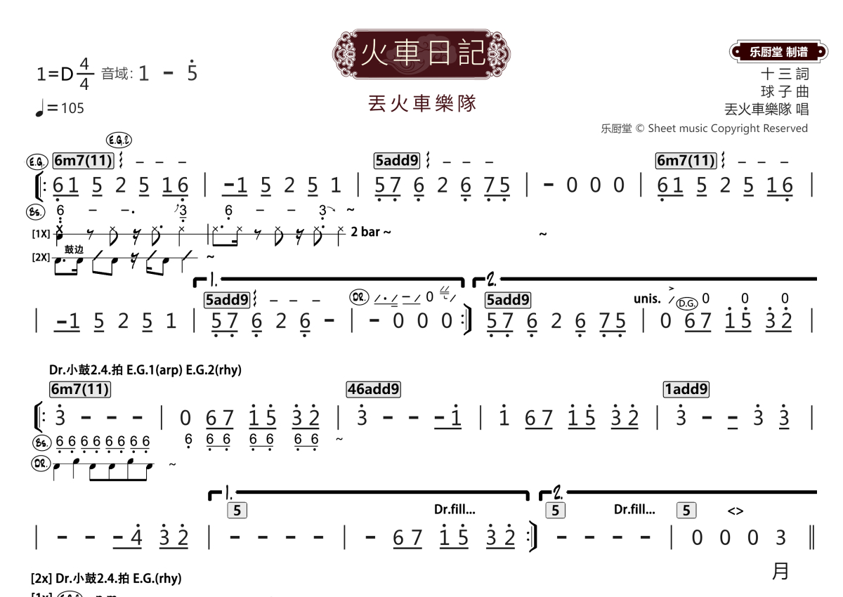 《火车日记》是丢火车乐队演唱的一首歌曲,这份乐队总谱共有三张高清图谱,图谱由 @乐厨堂 编配上传。