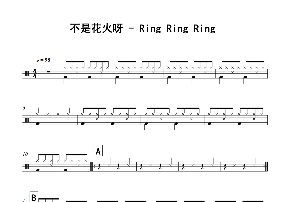 《Ring Ring Ring》是不是花火呀演唱的一首歌曲,这份架子鼓谱共有两张高清图谱,图谱由 @积极处世 编配上传,图谱使用五线谱编配,使用这份Ring Ring Ring架子鼓谱,你将能够轻松地敲打出这首不是花火呀的Ring Ring Ring,快来尝试吧。