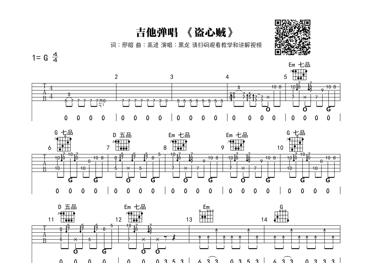 《盗心贼》是黑龙演唱的一首歌曲,本吉他谱采用的是G调指法编配,这份吉他谱共有三张高清图谱,图谱由 @深蓝雨吉他 编配上传,图谱使用六线谱编配,包含吉他和弦指法、简谱以及歌词部分,曲谱配备了相关的视频提供浏览,使用这份盗心贼吉他谱,可以让你更加方便地掌握这首歌曲的弹唱技巧,快来尝试吧。盗心贼吉他谱,黑龙演唱,歌曲原调C,选调G,如果觉得调太低,可以用变调夹夹2-3品。整首歌曲和声进行非常简单,且伴奏手法也很初级,主要以闷音扫弦和开放扫弦为主。每个相对独立的段落之间几乎都用扫弦演奏的弦律过门,。