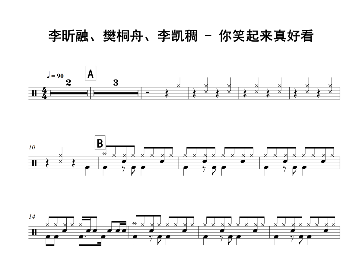李昕融、樊桐舟、李凯稠《你笑起来真好看》架子鼓谱