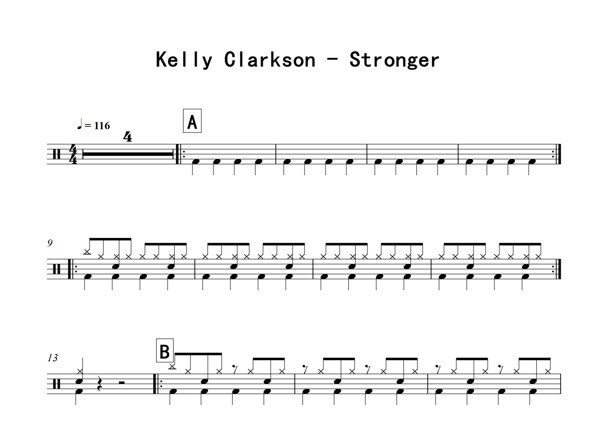 《Stronger》是Kelly Clarkson演唱的一首歌曲,这份架子鼓谱共有两张高清图谱,图谱由 @积极处世 编配上传,图谱使用五线谱编配,使用这份Stronger架子鼓谱,你将能够轻松地敲打出这首Kelly Clarkson的Stronger,快来尝试吧。