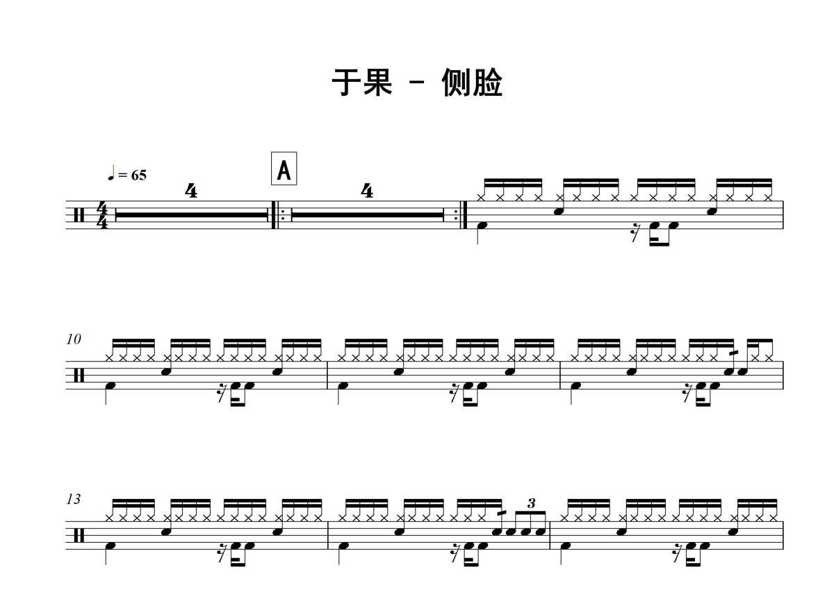 《侧脸》是于果演唱的一首歌曲,这份架子鼓谱共有两张高清图谱,图谱由 @积极处世 编配上传,图谱使用五线谱编配,使用这份侧脸架子鼓谱,你将能够轻松地敲打出这首于果的侧脸,快来尝试吧。