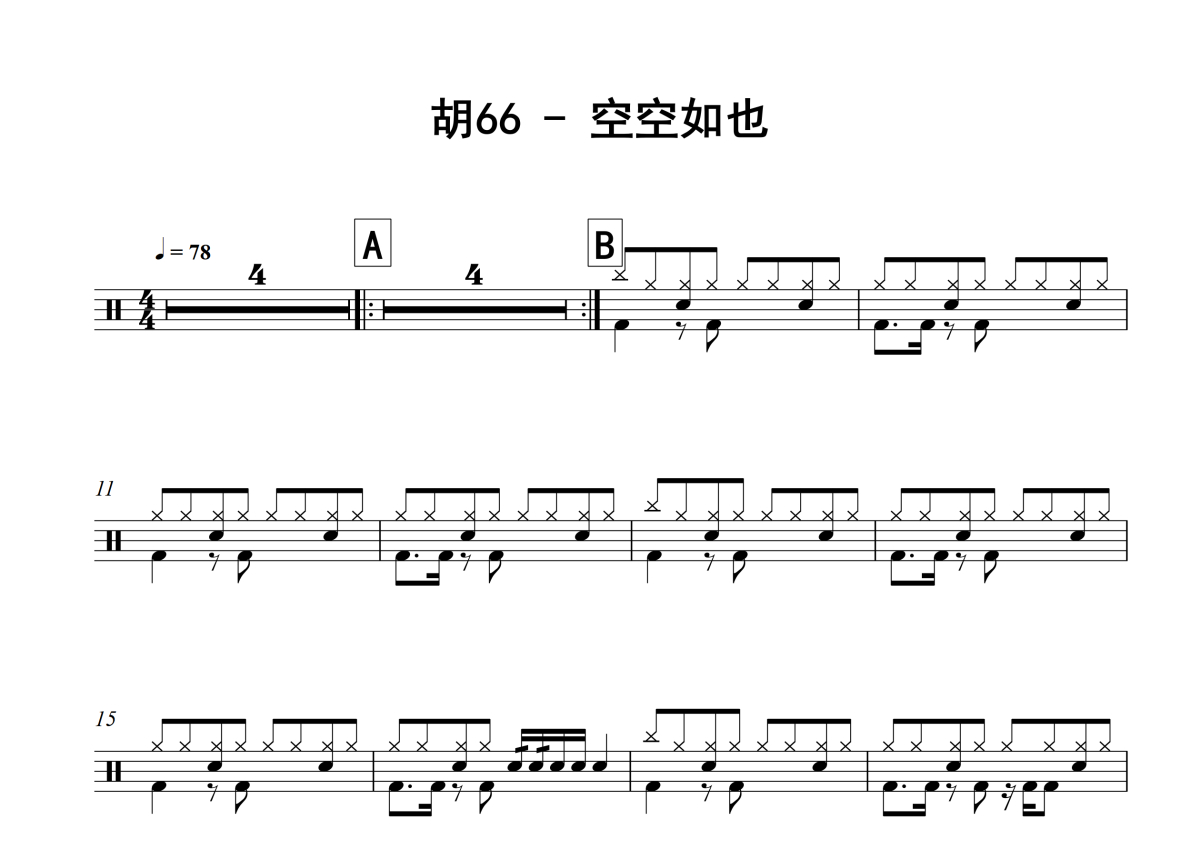 《空空如也》是胡66演唱的一首歌曲,这份架子鼓谱共有两张高清图谱,图谱由 @积极处世 编配上传,图谱使用五线谱编配,使用这份空空如也架子鼓谱,你将能够轻松地敲打出这首胡66的空空如也,快来尝试吧。