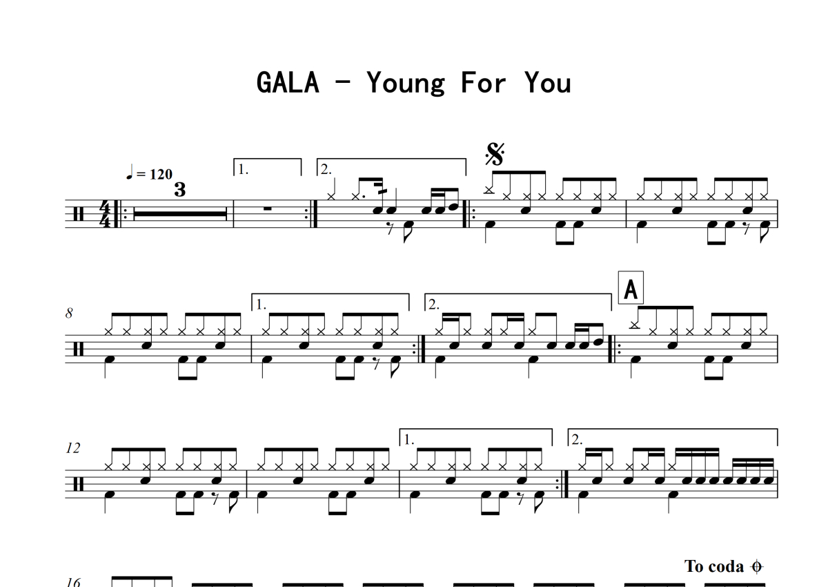 《Young For You》是GALA演唱的一首歌曲,这份架子鼓谱共有两张高清图谱,图谱由 @积极处世 编配上传,图谱使用五线谱编配,使用这份Young For You架子鼓谱,你将能够轻松地敲打出这首GALA的Young For You,快来尝试吧。