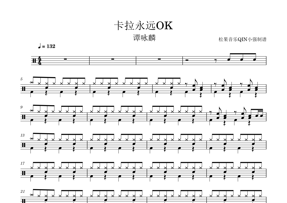 《卡拉永远OK》是谭咏麟演唱的一首歌曲,拍号为4/4拍,这份架子鼓谱共有两张高清图谱,图谱由 @松果音乐QIN小强 编配上传,图谱使用五线谱编配,使用这份卡拉永远OK架子鼓谱,你将能够轻松地敲打出这首谭咏麟的卡拉永远OK,快来尝试吧。《卡拉永远OK》是谭咏麟作曲并演唱的一首歌曲 。该曲分粤语、普通话两个版本,粤语版由潘源良作词,收录在谭咏麟1990年1月23日发行的粤语专辑《梦幻舞台》中 ;普通话版由刘虞瑞作词,收录在谭咏麟1990年5月30日发行的普通话专辑《难舍难分》中。