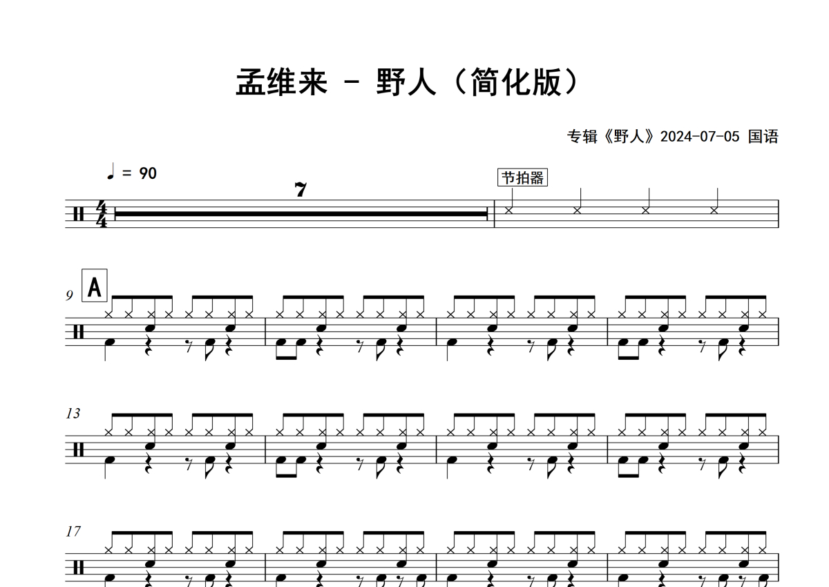 孟维来《野人》架子鼓谱 - 简化版