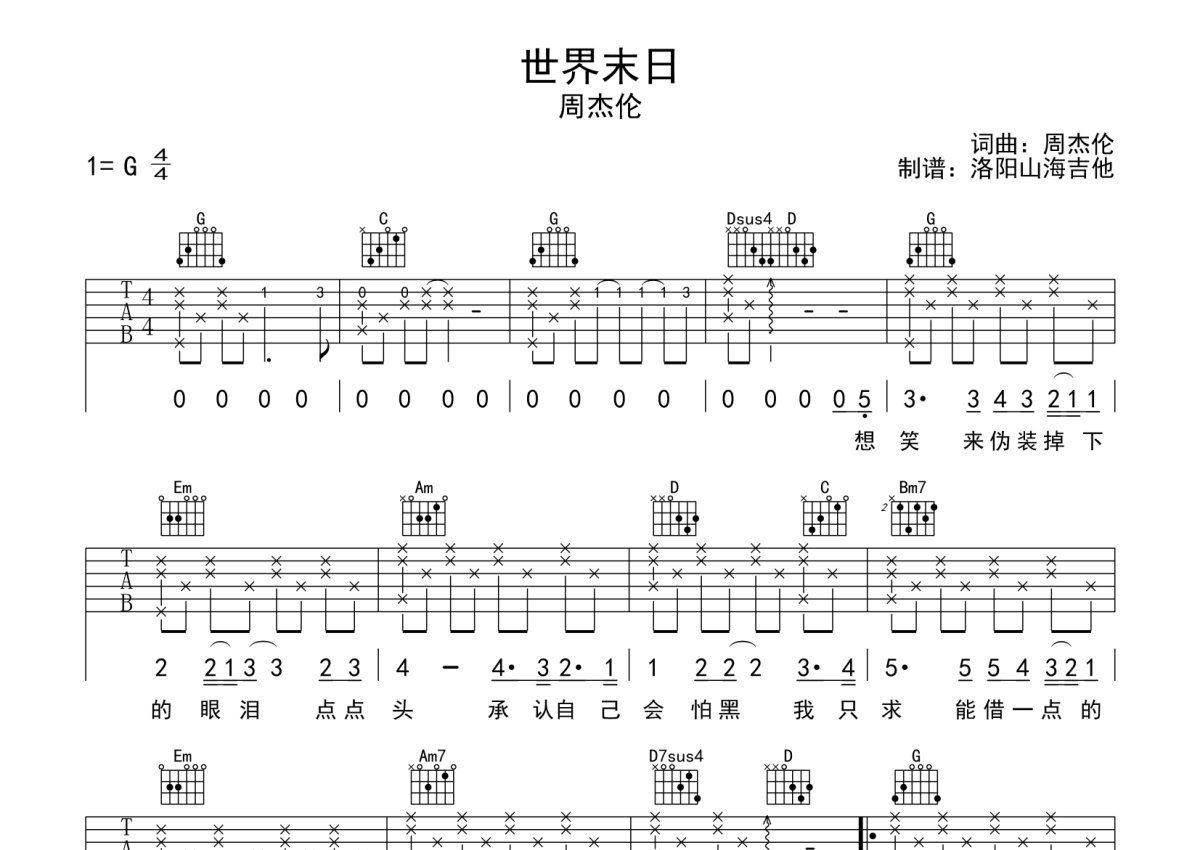 周杰伦《世界末日》吉他谱 - G调弹唱六线谱