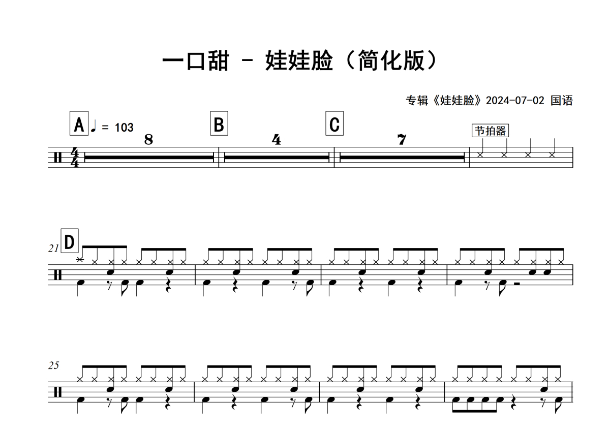 《娃娃脸》是一口甜演唱的一首歌曲,简化版,拍号为4/4拍,歌曲速度为每分钟103拍,这份架子鼓谱共有两张高清图谱,图谱由 @举个例子 编配上传,图谱使用五线谱编配,使用这份娃娃脸架子鼓谱,你将能够轻松地敲打出这首一口甜的娃娃脸,快来尝试吧。