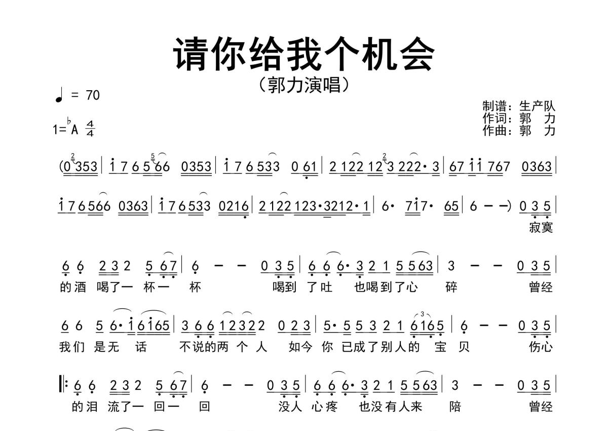 《请你给我个机会》是郭力演唱的一首歌曲,原版简谱,拍号为4/4拍,歌曲速度为每分钟70拍,这份简谱共有一张高清图谱,图谱由 @生产队 编配上传郭力创作并演唱的歌曲《请你给我个机会》原版简谱,精准的前奏、间奏solo编配。