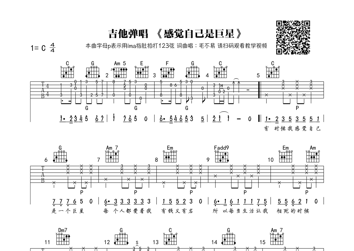 毛不易《感觉自己是巨星》吉他谱 - C调弹唱六线谱